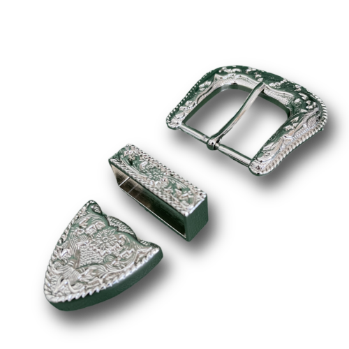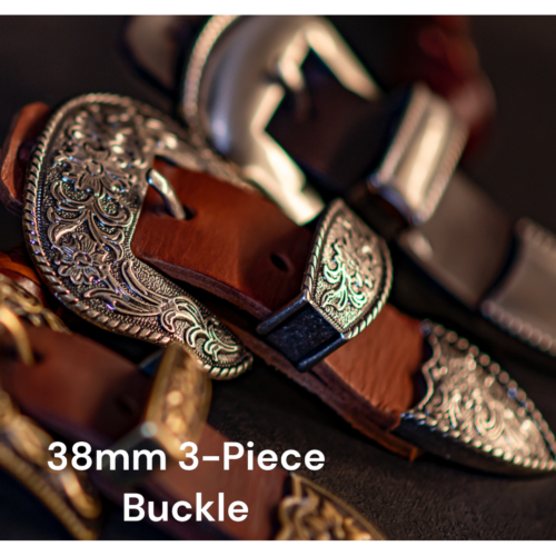 These buckles are known as 3-piece because they have 3 parts to them – The Tip, Keeper and Buckle. They are very popular on country style belts’ 3-piece buckle refers to a type of buckle that consists of three separate components: a frame, a prong, and a bar. The frame is the outermost part of the buckle that holds the other two components in place. The prong is the piece that fits through a hole in the strap or band to secure the buckle, while the bar is the part that slides into the frame to secure the prong in place.