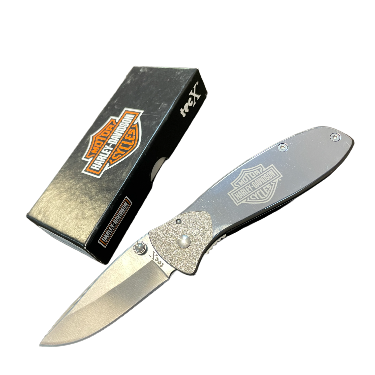 Polished stainless handles with textured bolster. Front handle has logo etch. Stainless pocket clip.