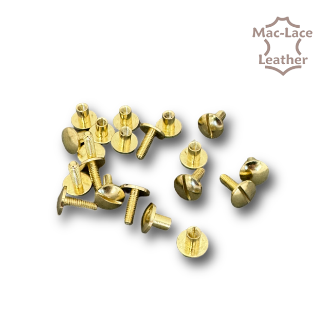 These Chicago Screws have a 10mm threaded shaft, 10mm wide domed top and 8mm long stem. They are commonly used for thicker saddlery leathers. Punch a 6mm hole to allow for positioning.