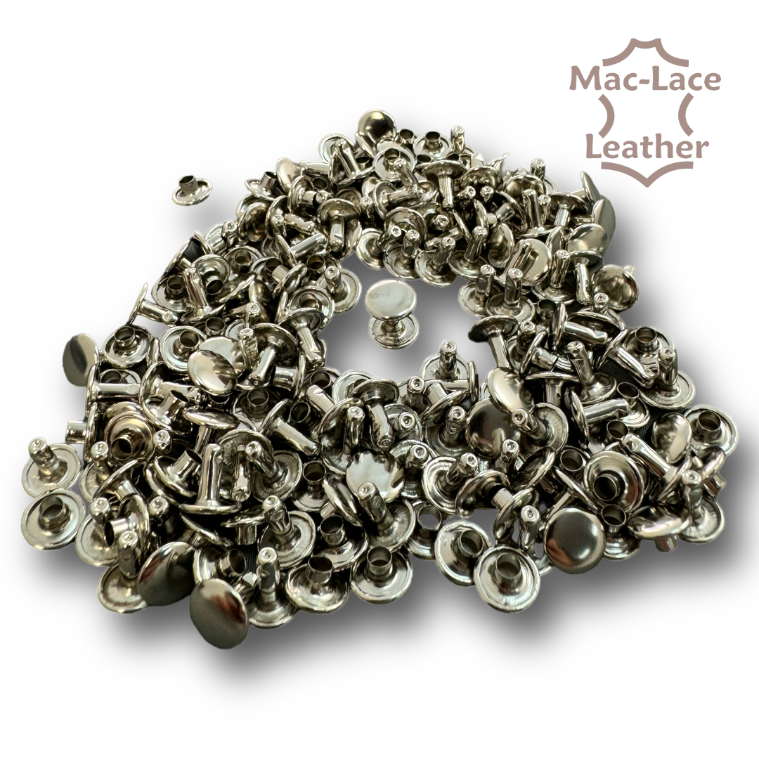 2 -Piece Speedie Rivet with a domed top and domed base – so when they are set the rivet looks the same from both sides of the leather. Cap size is 9mm – Stem Length 8mm… always allow 1-2 mm for the rivets to compress together.