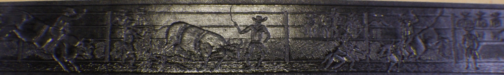 Black Embossed Leather Belt, 38mm wide with Rodeo pattern. These straps need to be finished and dyed to suit. Length is min of 1.2 M and thickness is about 3.6 mm.
