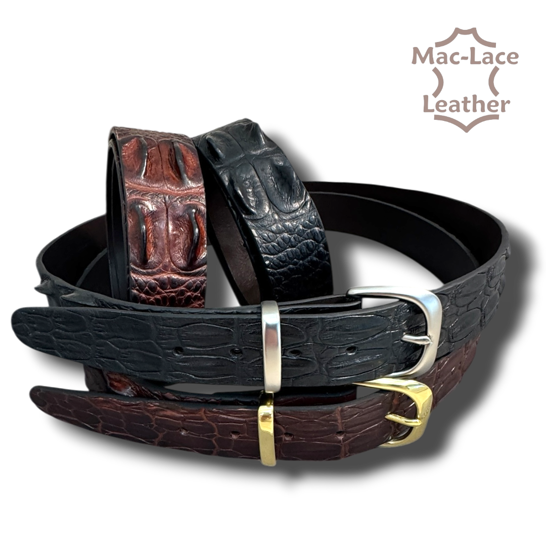 Available in classic black and rich brown, this luxurious crocodile leather belt is completed with your choice of antique brass or nickel hardware, offering a sophisticated contrast against the natural depth of the leather. The addition of a Keeper not only improves functionality but also adds a polished and premium appearance.