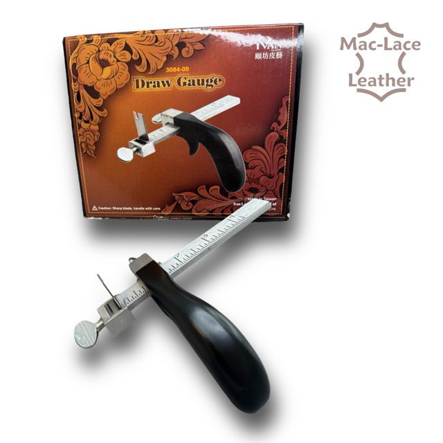 Professional strap cutter for cutting belt blanks and leather straps. Features ergonomically designed aluminum handle and measurement gauge.