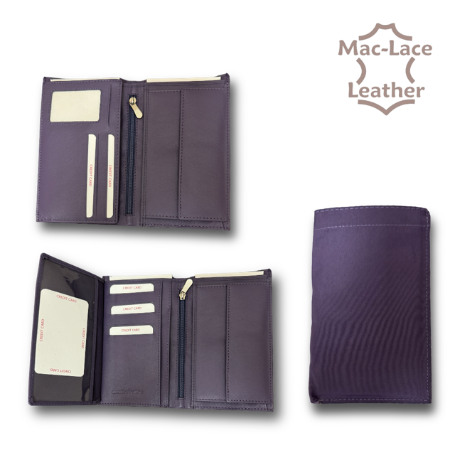 Ladies Purple Leather wallet inner featuring 11 Credit card slots, 1 ID pocket, 2 notes pockets. Size when open 155mm x 195mm. Needs to have the leather back attached (not supplied).