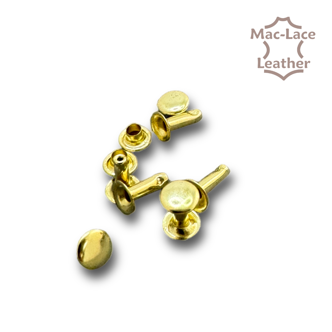 2 -Piece Speedie Rivet with a domed top cap and flat base. Cap size is 6mm – Stem Length 8mm… always allow 1-2 mm for the rivets to compress together. These rivets are brass platted.