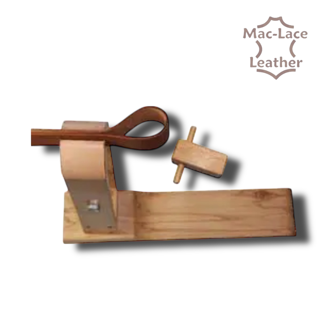 Large timber stitching horse used to hold the leather in place while hand stitching.